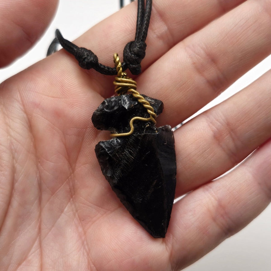 La punta in ossidiana, dalla forma irregolare e autentica, misura circa 4-6 cm in altezza e 2-3 cm in larghezza. Ogni pietra è selezionata con attenzione e incastonata con metallo intrecciato a mano, che ne esalta i riflessi e la struttura naturale. Il ciondolo è completato da un cordino regolabile in cotone cerato, resistente e confortevole, adatto a ogni stile, sia casual che più ricercato.