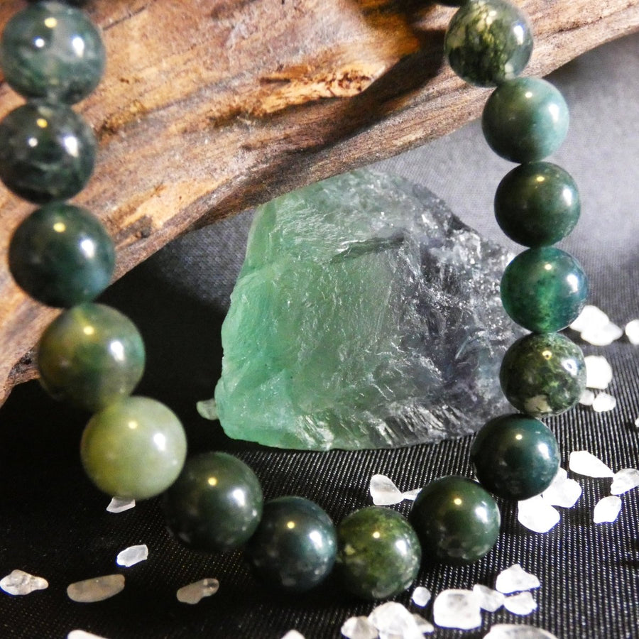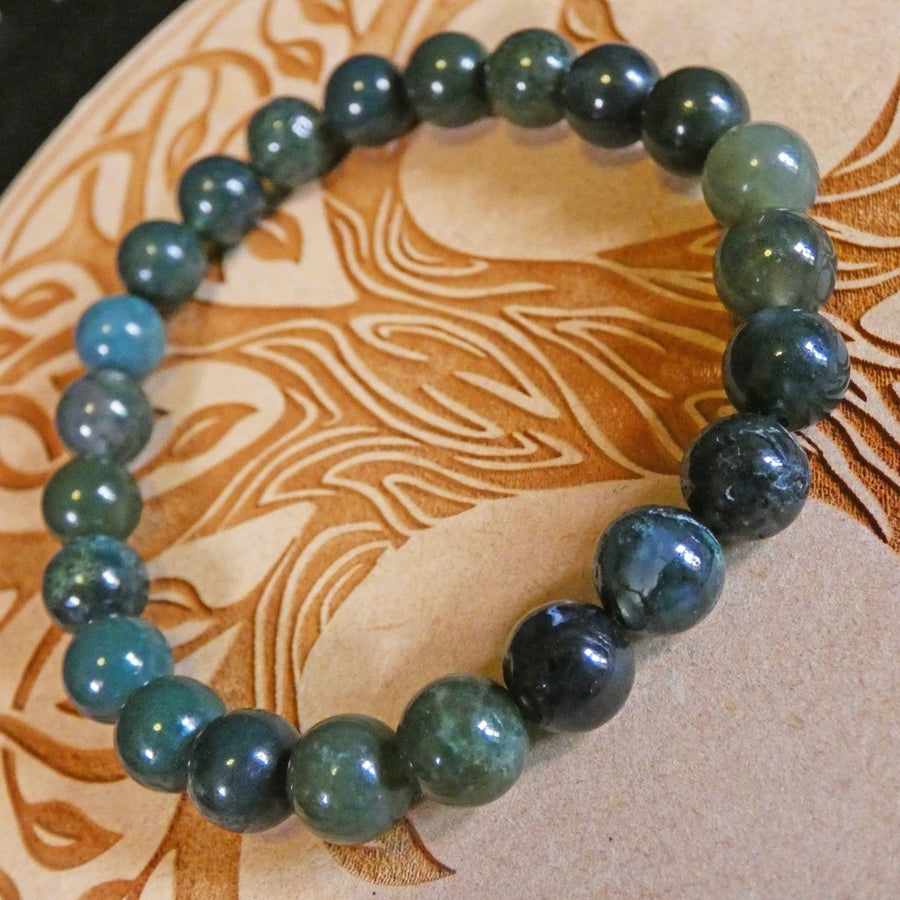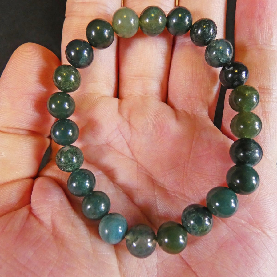 Realizzato con sfere da 8 mm di Agata Muschiata, questo bracciale unisce estetica naturale ed energia positiva. Ogni sfera presenta un motivo unico, con venature verdi che ricordano il muschio, offrendo un aspetto organico e affascinante. La superficie liscia e la finitura brillante evidenziano la qualità della lavorazione artigianale.