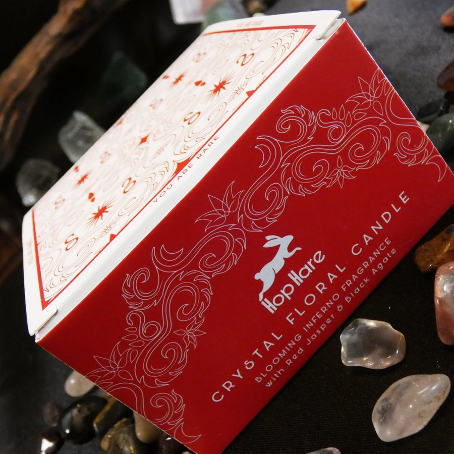 Sulla superficie della candela sono incastonate pietre vere di diaspro rosso e agata nera, che infondono nella cera le loro proprietà energetiche, trasformando la semplice accensione in un rituale di potenziamento personale.