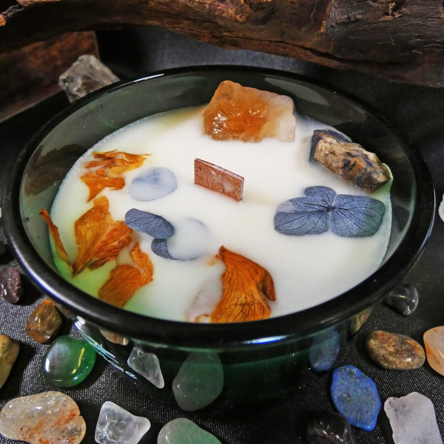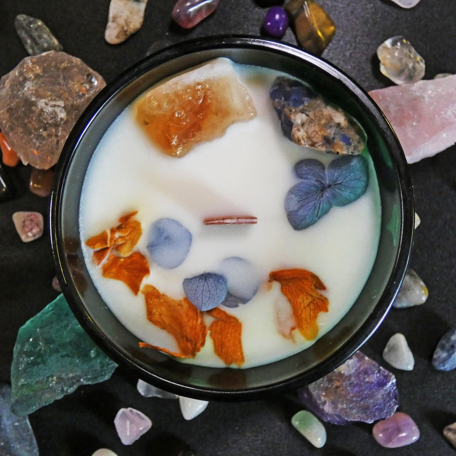 La superficie della candela è impreziosita da petali essiccati, citrina e sodalite, rendendola ideale anche come oggetto decorativo per spazi sacri o ambienti domestici. Le proprietà energetiche dei cristalli vengono infuse nella cera durante la combustione, rendendola un valido strumento per la meditazione, la riflessione o i rituali solari.