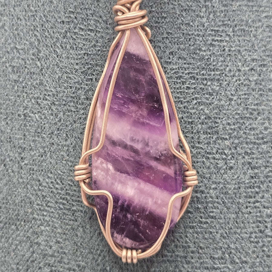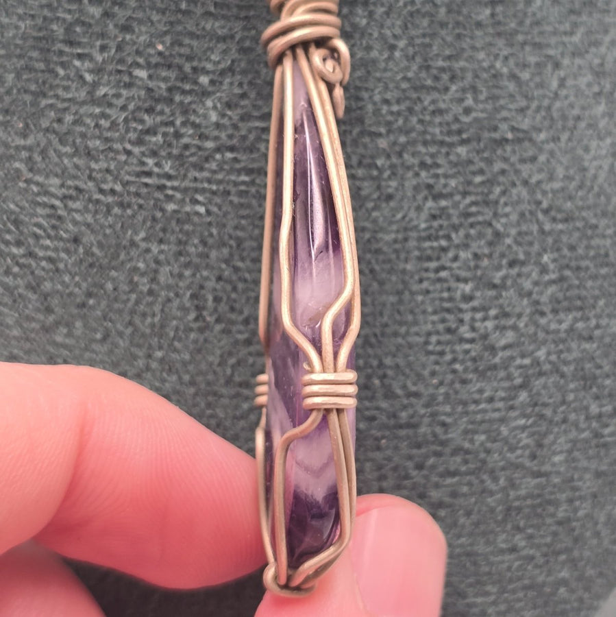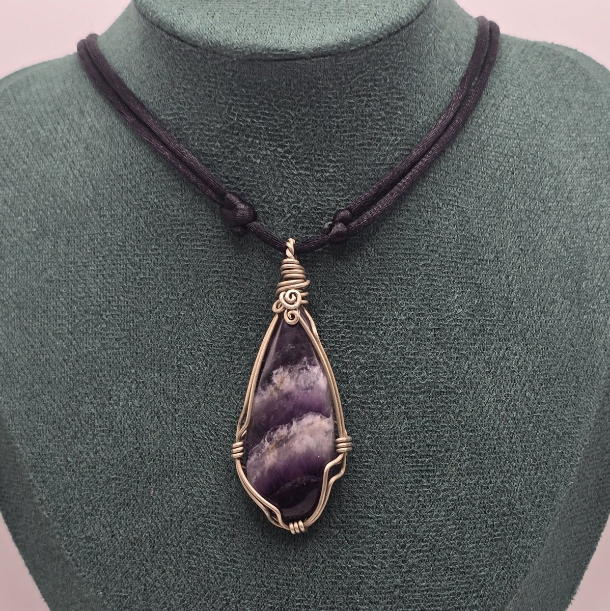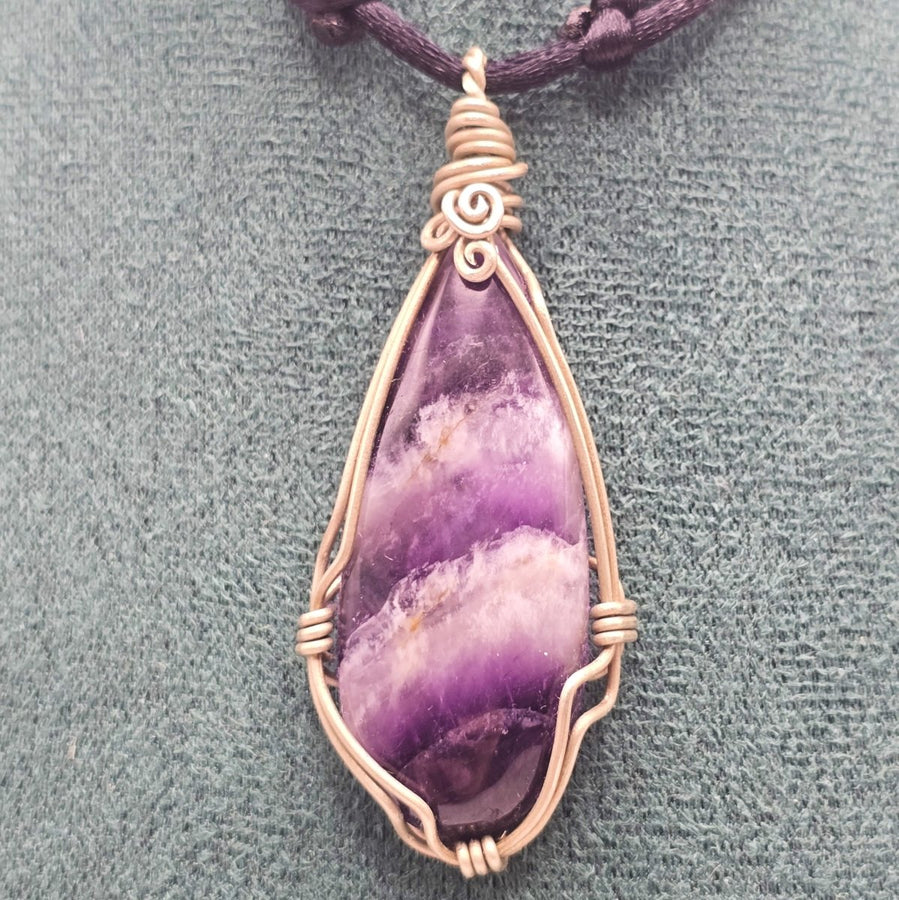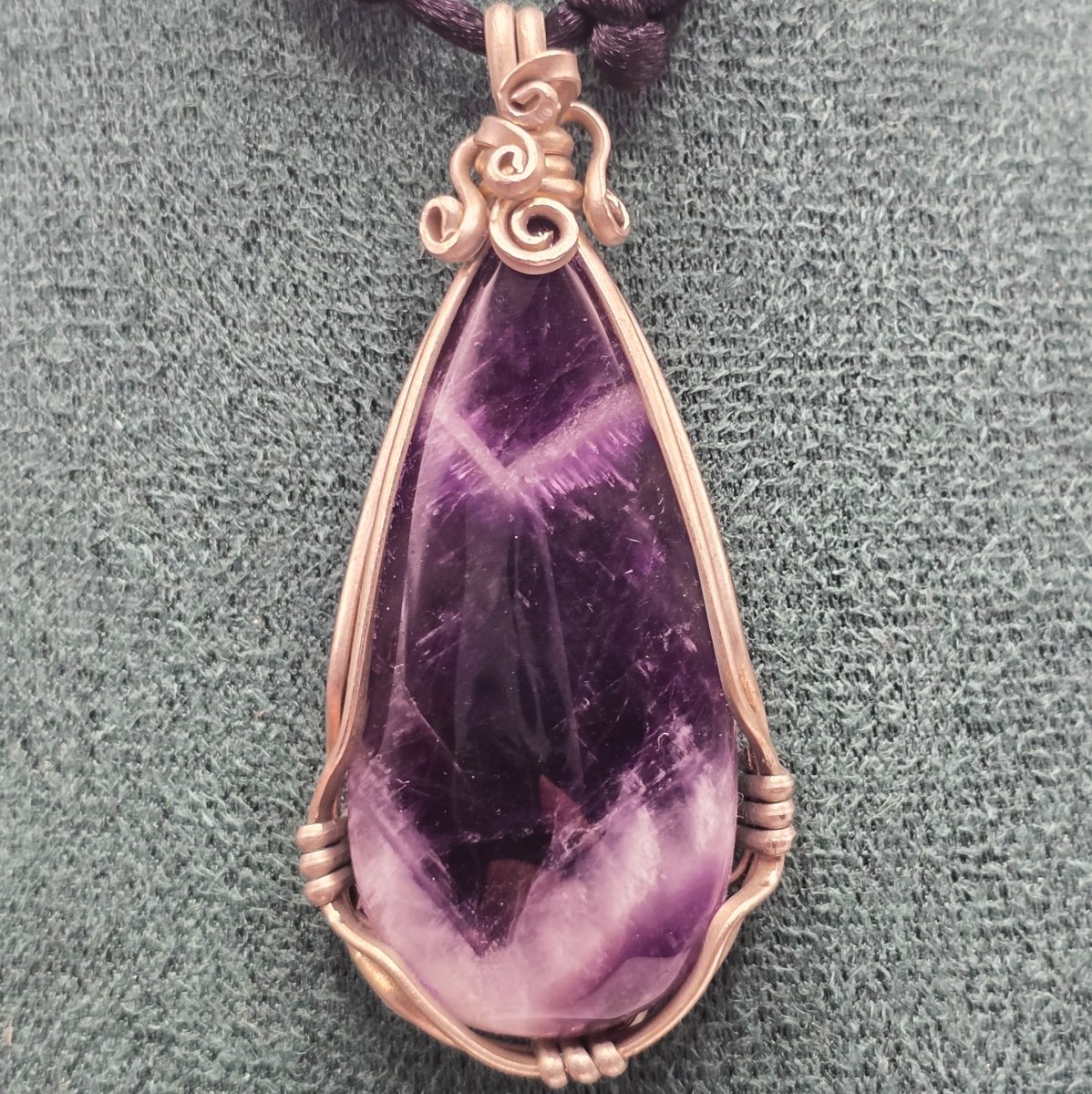 La forma a goccia, valorizza le venature naturali dell’ametista, creando giochi cromatici morbidi e profondi. La pietra è avvolta da una montatura in metallo lavorata a mano, progettata per sostenere e mettere in risalto le sfumature irregolari della gemma senza sovrastarle. L’intreccio segue le linee naturali del cristallo, dando vita a un amuleto dall’estetica raffinata ma autentica.