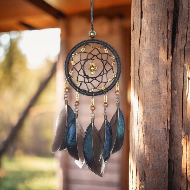 Il cerchio è realizzato in legno avvolto da filo nero e contiene una rete centrale intrecciata a mano. Al suo interno si trova un piccolo ciondolo dorato che richiama la simbologia della “rete della vita”, rendendo ogni pezzo unico. Le corde di cotone e le piume naturali scure scendono con eleganza dalla base, impreziosite da perline marroni e dorate che aggiungono luminosità al design.