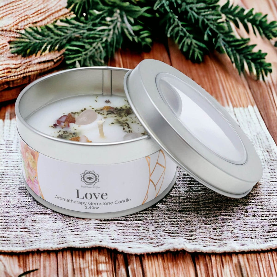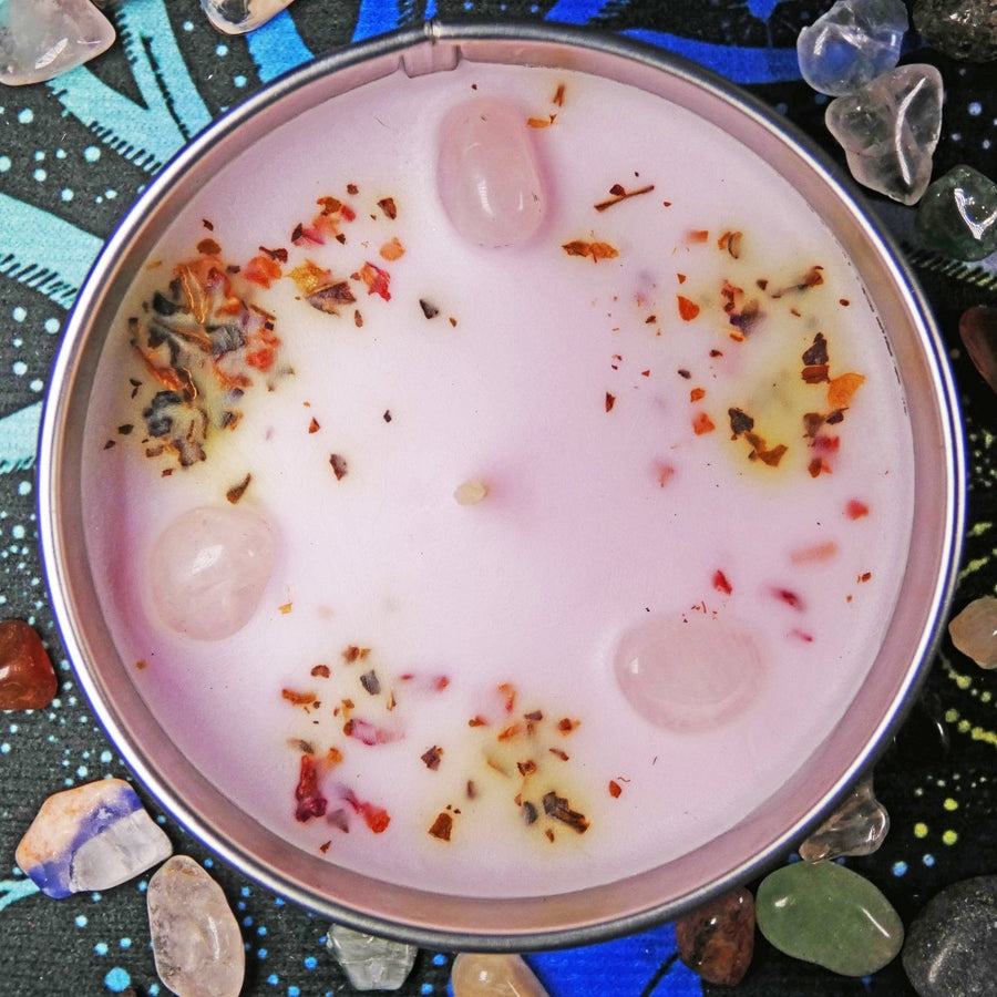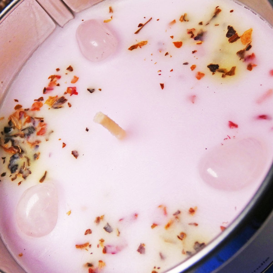 Candela Profumata Artigianale con Quarzo Rosa, Rosa e Basilico - Amore e benessere emotivo.