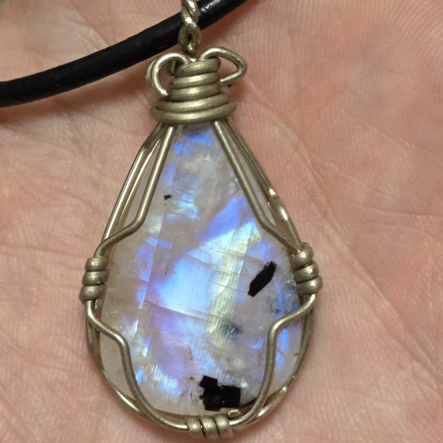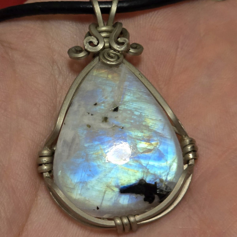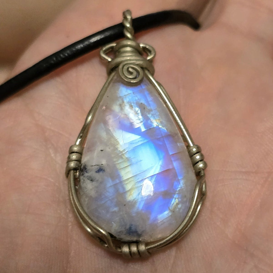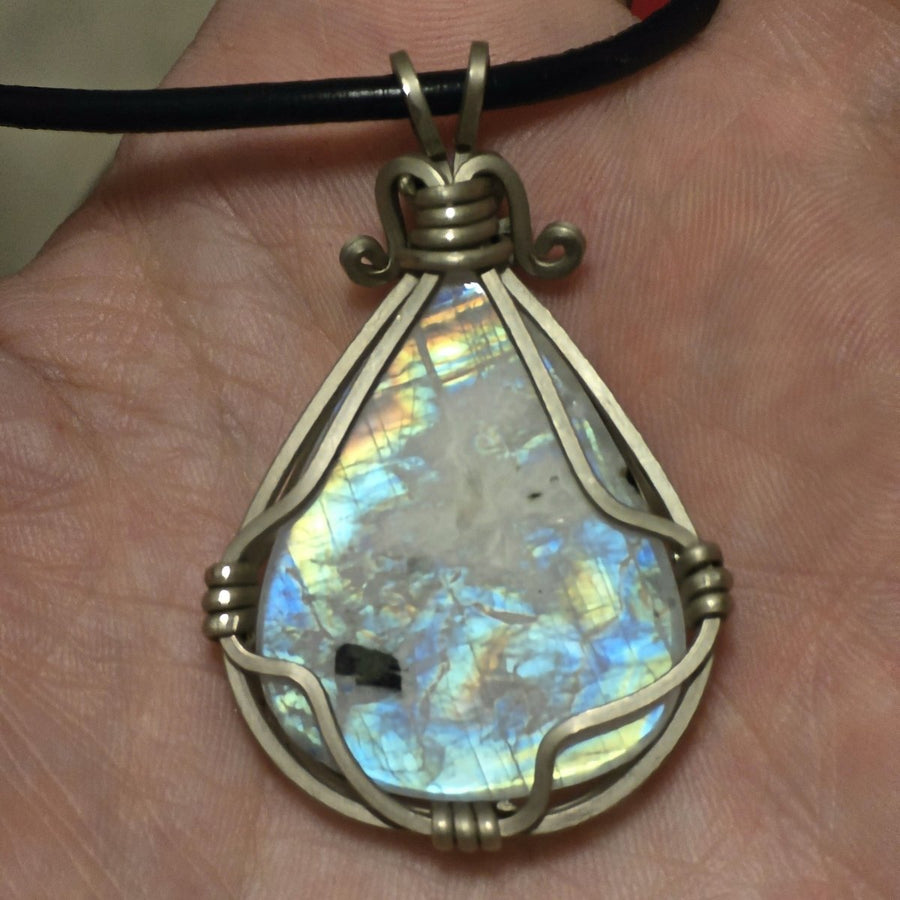 Questa collana artigianale è un gioiello elegante e senza tempo, pensato per chi ama unire raffinatezza, significato e materiali naturali di pregio. Il pendente presenta una Labradorite Bianca del Canada di qualità extra AAA a goccia, una gemma luminosa dai riflessi cangianti e dalle delicate sfumature iridescenti che evocano la luce lunare. Ogni pietra, accuratamente selezionata, misura tra i 2,5 e i 4,5 cm di altezza ed è incastonata in una montatura realizzata a mano in metallo, lavorato con maestria per creare un design armonico e distintivo.