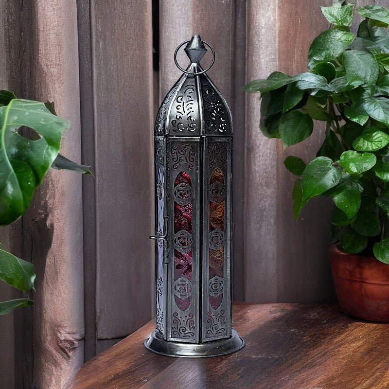 Con un'altezza di 30 cm e una base larga 8,5 cm, questa lanterna è perfetta sia come decorazione centrale sia per creare un angolo di meditazione personale. Il suo design verticale slanciato la rende adatta a essere posizionata su tavolini, altari, scaffali o direttamente a terra. Grazie al gancio superiore, può anche essere appesa, adattandosi a vari stili di arredo, dal boho chic allo zen.