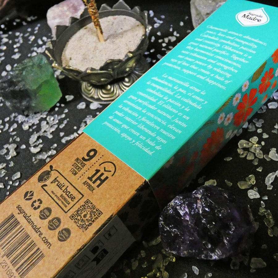 Scegli l’incenso naturale Sagrada Madre con calendula, camomilla e olibano per donare equilibrio e delicatezza alla tua giornata. Ogni bastoncino è un invito a respirare profondamente e creare uno spazio sacro di calma e benessere.