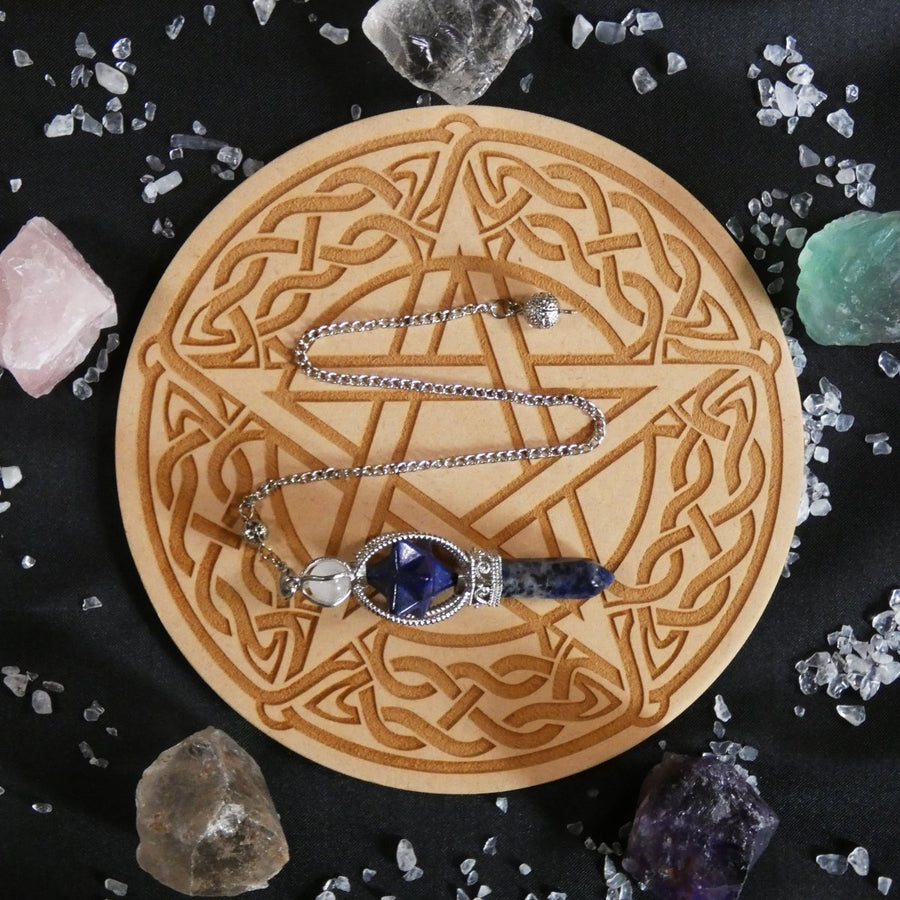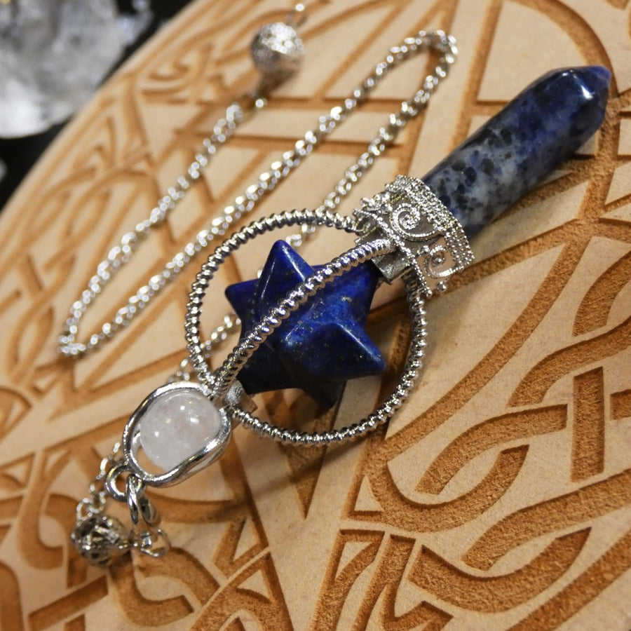 La forma Merkaba rappresenta l’unione tra corpo, mente e spirito e agisce come vettore di protezione e connessione multidimensionale. Il lapislazzuli, pietra associata al terzo occhio e alla comunicazione interiore, favorisce la chiarezza mentale, l’intuizione e l’evoluzione spirituale. Il cristallo di quarzo, collocato strategicamente nella struttura, lavora come amplificatore, potenziando l’energia del pendolo e rendendolo altamente reattivo.