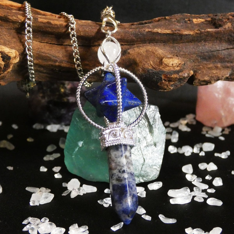 • Pendolo composto da: Merkaba in lapislazzuli, punta in lapislazzuli, cristallo di quarzo e struttura in metallo decorata
