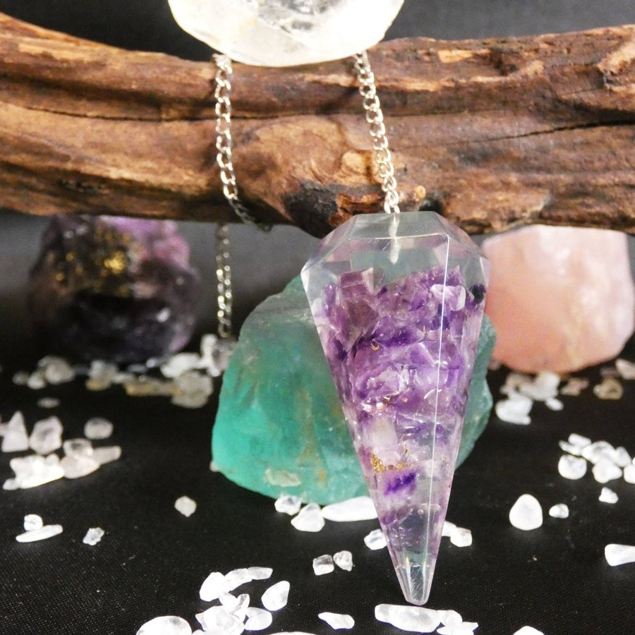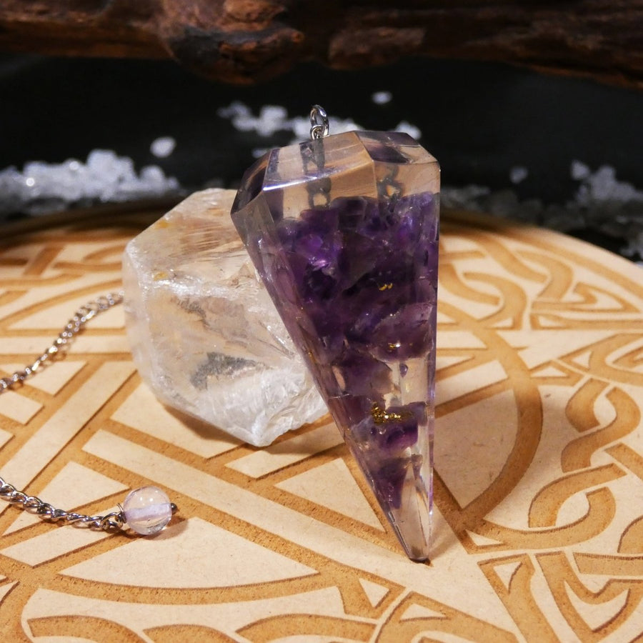 Il design raffinato del pendolo include una punta in ametista levigata, incastonata in una base di orgonite. Il risultato è un oggetto esteticamente piacevole e funzionalmente bilanciato, comodo da impugnare e sensibile al movimento energetico.
