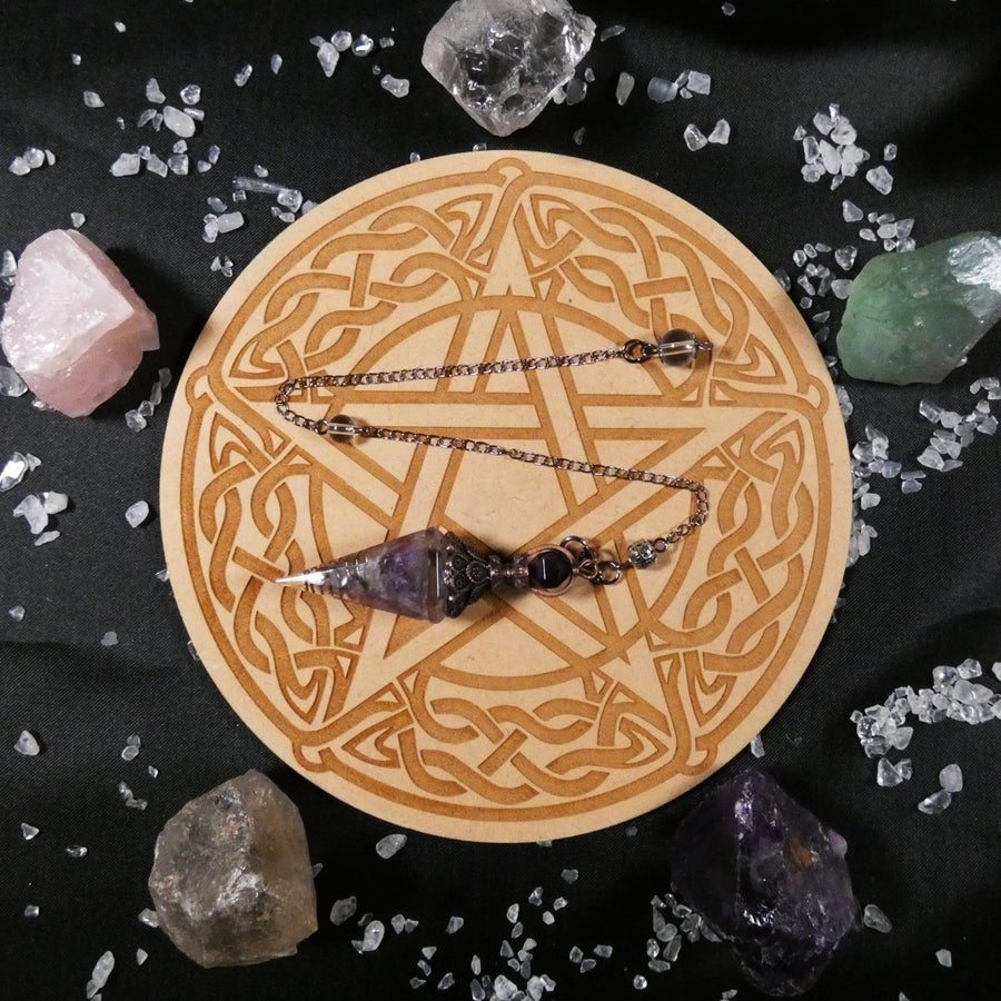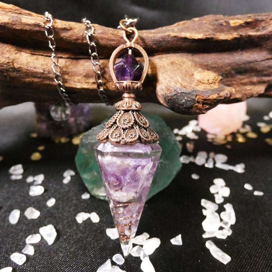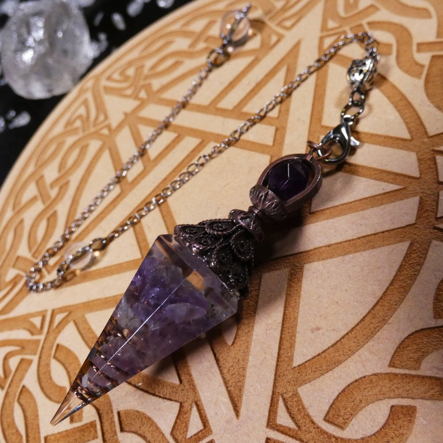 Il cuore energetico del pendolo è costituito da ametista naturale, pietra celebre per la sua capacità di calmare la mente, favorire la meditazione e stimolare il contatto con il sé superiore. In sinergia con l’orgonite, che agisce come armonizzatore dell’energia vitale, e con la spirale di rame, che ne amplifica il potenziale, questo strumento si distingue per equilibrio e intensità.