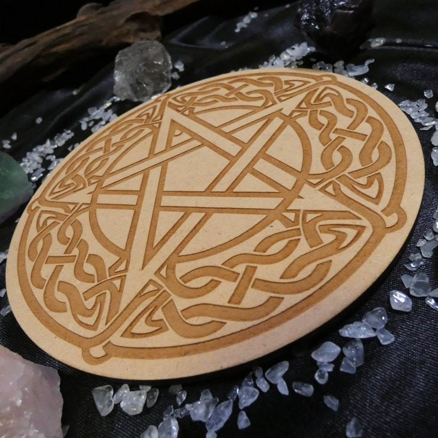 Il design è inciso con attenzione, evidenziando i tratti simbolici del Pentacolo, uno dei simboli più antichi e potenti nella tradizione esoterica. La sua presenza in uno spazio eleva la vibrazione, favorisce la centratura interiore e crea un ambiente più armonico e protetto.